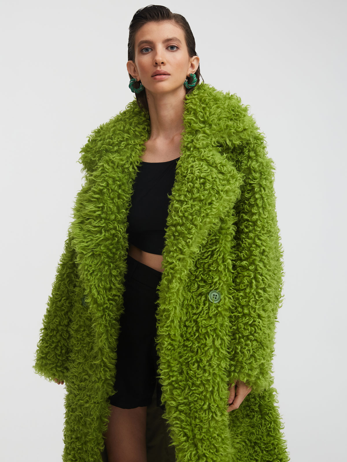 Зеленая шуба MILAMARSEL из 100% шерсти – самая эффектная модель в коллекции премиальных экошуб. За счет мягкого и очень приятного на ощупь длинного ворса и трендового зеленого оттенка она становится главным акцентом образа и идеально подходит для ярких и смелых аутфитов.