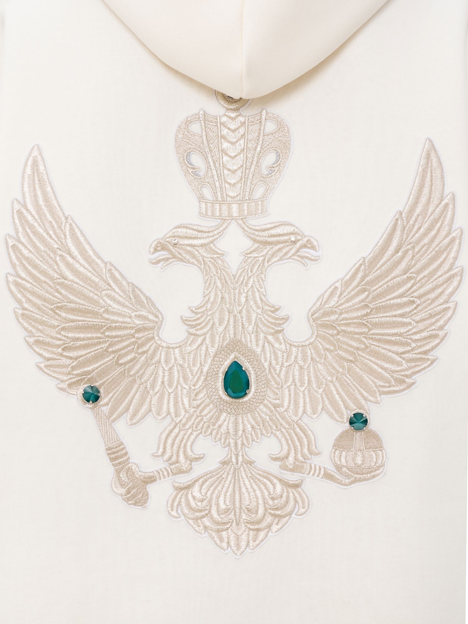 Лимитированное худи «Золотой орел» является продолжением коллекции MILAMARSEL, посвященной России и ее главным образам и символам. Худи повторяет принт экошубы из 100% шерсти – двуглавый орел вышит золотыми нитями старинной техникой «в прикреп» торжокскими золотошвеями и декорирован крупными изумрудными камнями Swarovski. Уникальное сочетание спортивного худи и премиальной ручной вышивки делает изделие абсолютно эксклюзивным и соответствует последним тенденциям мировой модной индустрии на смешение стилей и эклектику. Благодаря универсальному дизайну худи одинаково подходит как женщинам, так и мужчинам.