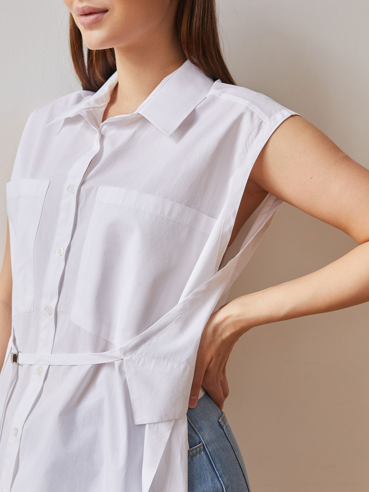 Белая блуза из 100% хлопка отличается сложным асимметричным кроем. Спереди более длинная часть, а сзади укороченная, которая добавляет фигуре большей женственности. Необычный пояс позволяет делать акцент на талии и по-разному завязывать блузу, создавая новые и нестандартные комбинации. Такая модель подойдет для креативных и ярких девушек, которые ценят эксклюзивный дизайн и индивидуальный стиль.