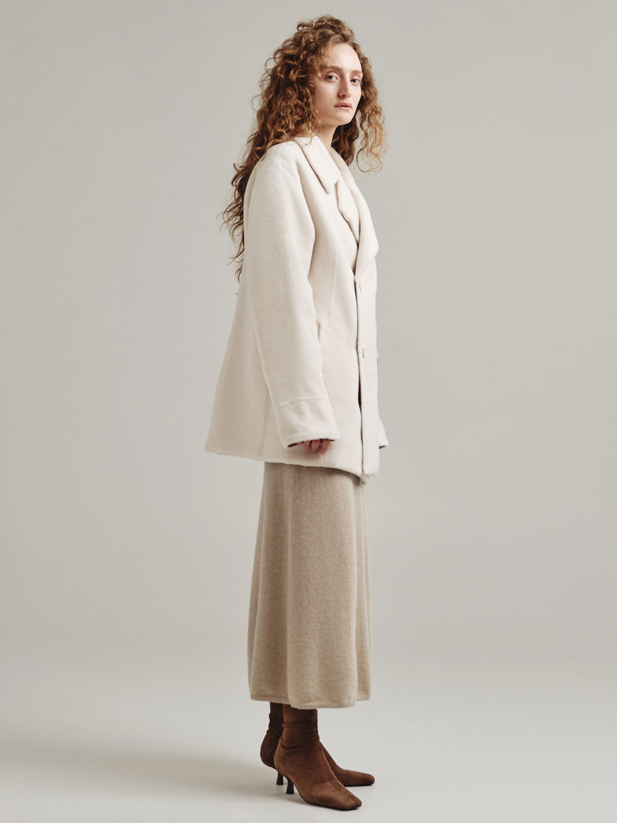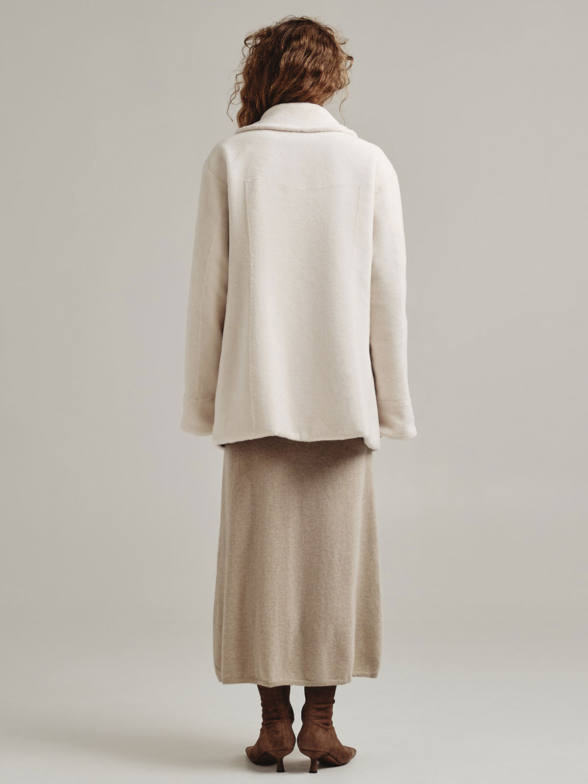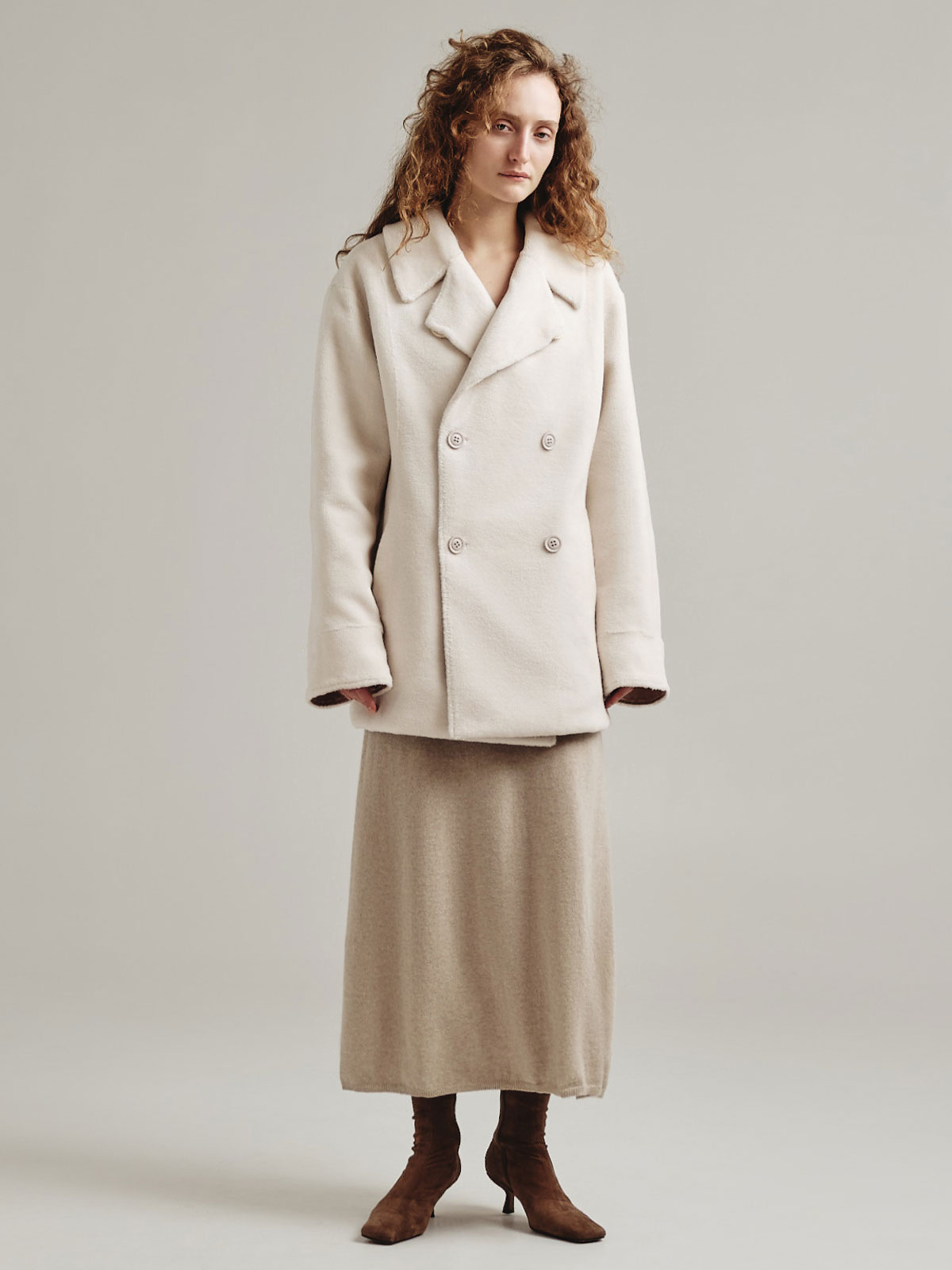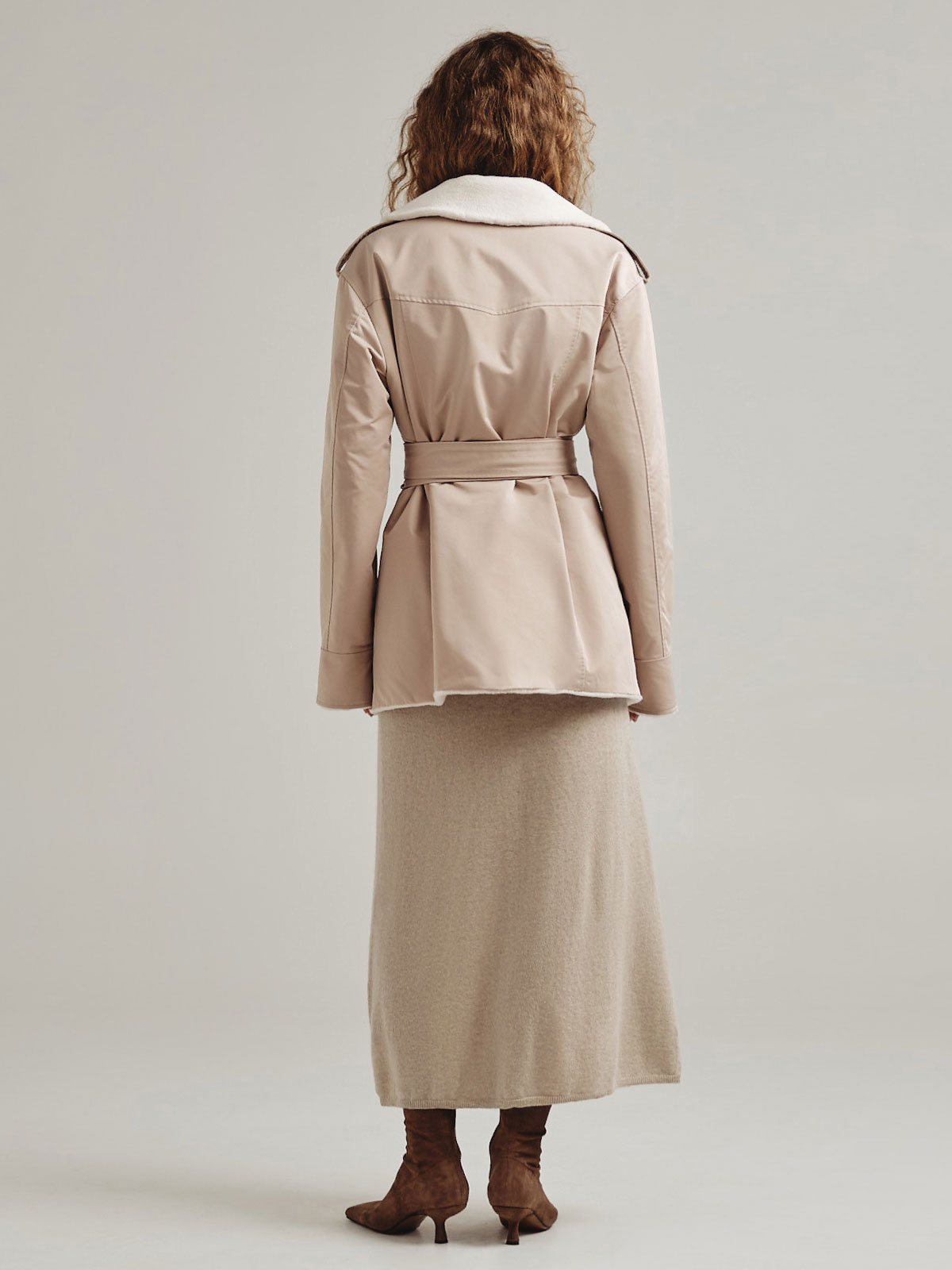 Двусторонняя модель из короткой тонкой шерсти отсылает к классическому тренчу, но представлена в виде легкой экошубы. Изделие дополнено авторским принтом MILAMARSEL с голубыми птицами.