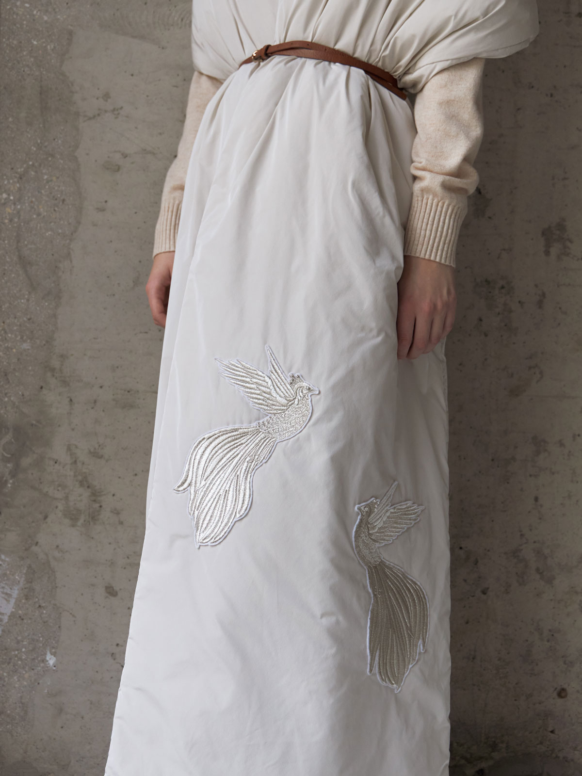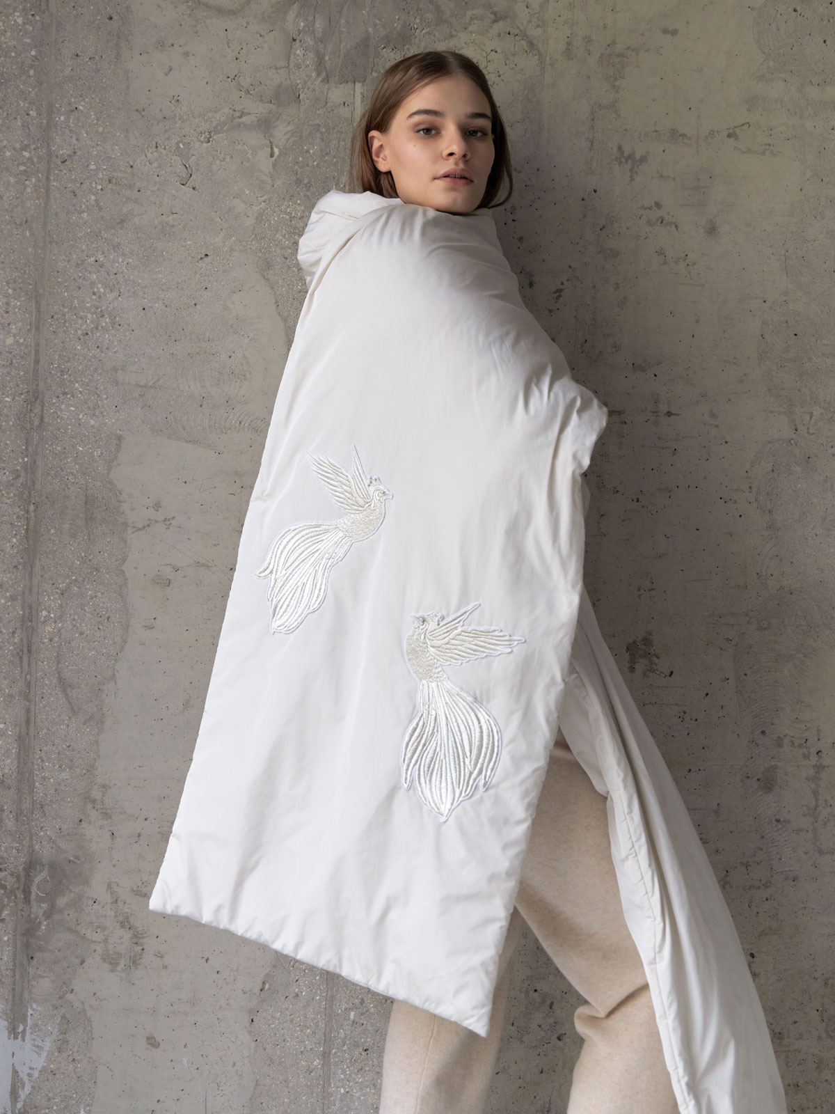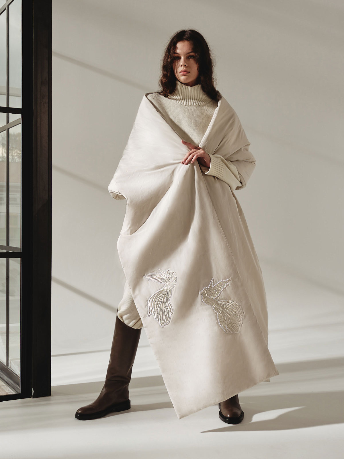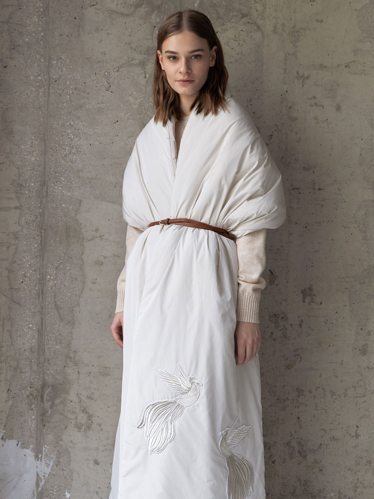 Пуховый шарф-кейп утеплен селективным пухом и дополнен фирменной вышивкой «Птицы», выполненной золотыми нитями. Его можно сочетать с ключевым образом коллекции Romanoff – моделью-трансформером «Всадница», а также добавлять к любому изделию из коллекции Romanoff или MILAMARSEL Premium или носить отдельно в качестве длинного кейпа.