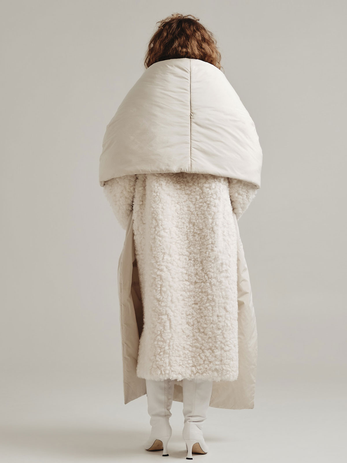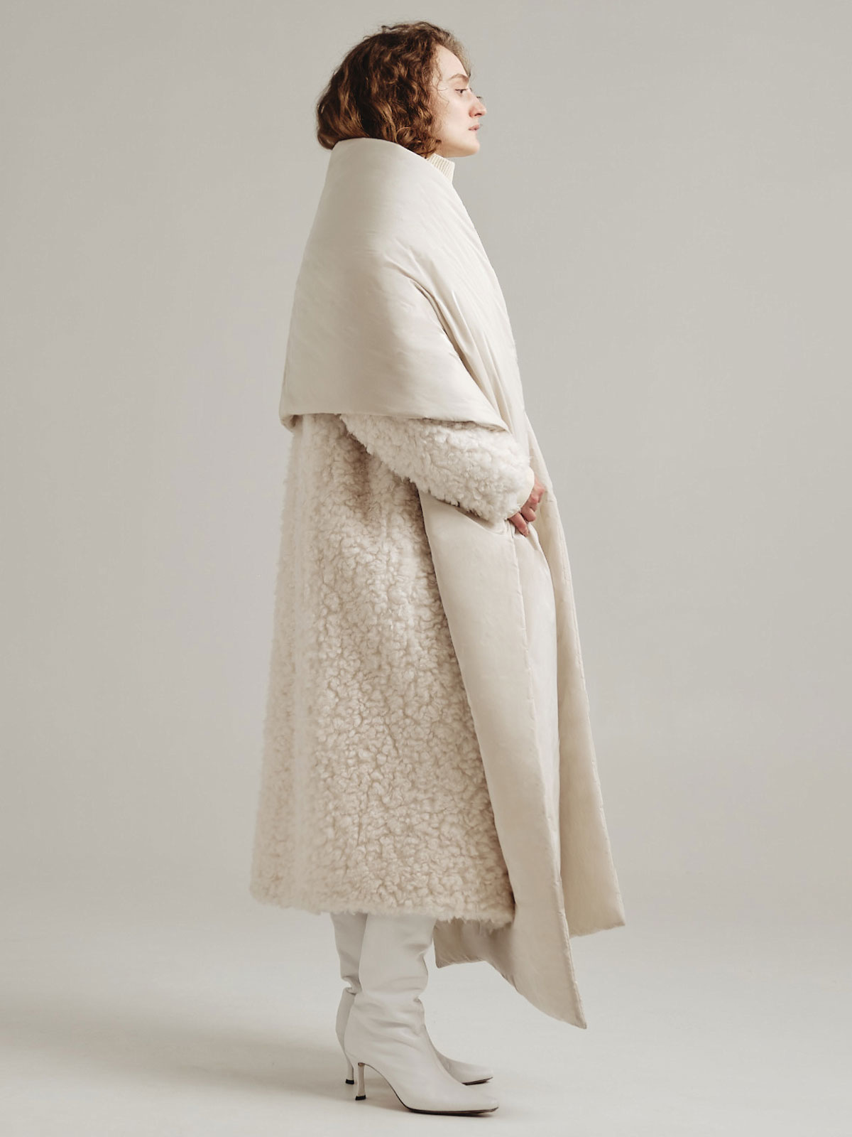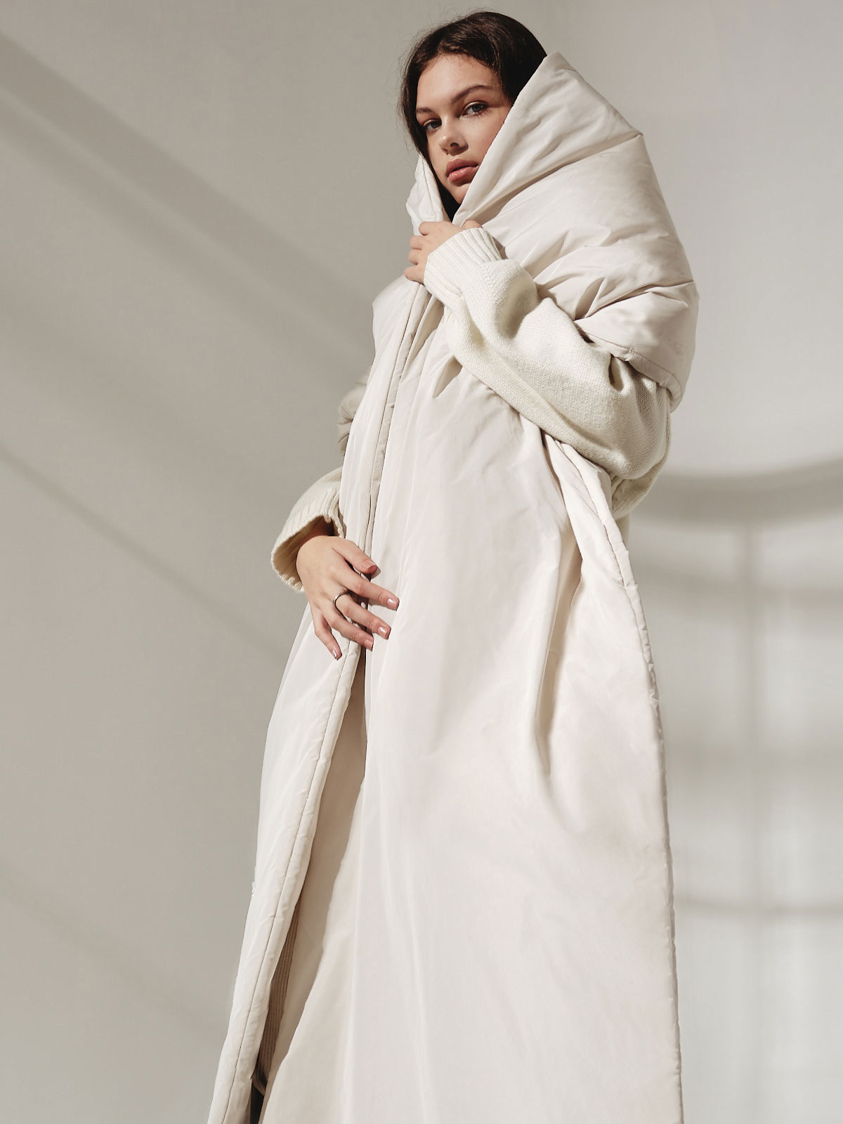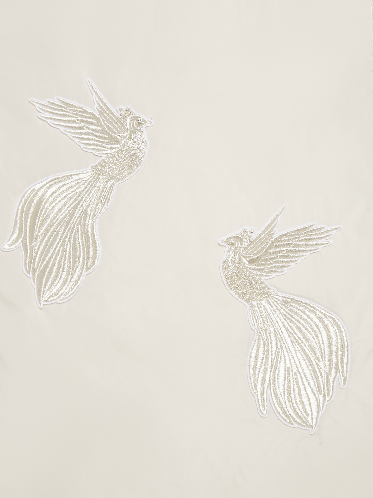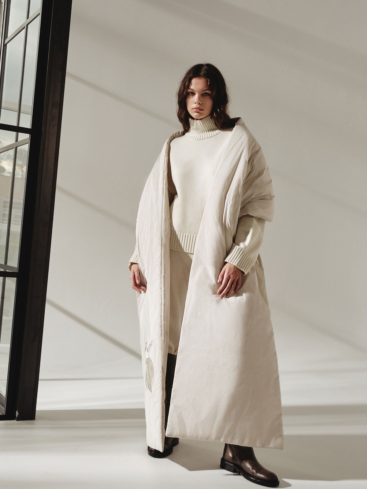 Пуховый шарф-кейп утеплен селективным пухом и дополнен фирменной вышивкой «Птицы», выполненной золотыми нитями. Его можно сочетать с ключевым образом коллекции Romanoff – моделью-трансформером «Всадница», а также добавлять к любому изделию из коллекции Romanoff или MILAMARSEL Premium или носить отдельно в качестве длинного кейпа.