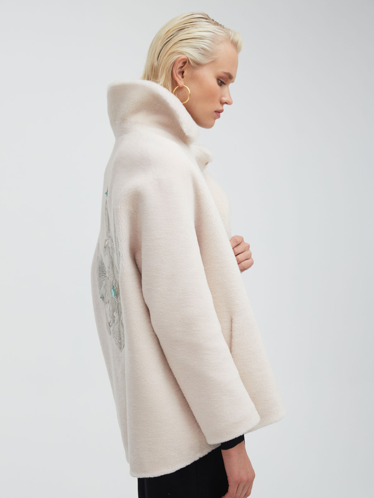 Укороченная шуба из 100% шерсти с двуглавым орлом, вышитым нитями из белого золота – одно из самых роскошных изделий в коллекции. Это исключительное сочетание современных трендов, высоких технологий, эксклюзивного дизайна в русском стиле и исконно русских промыслов, которые воплотились в актуальной и свежей интерпретации. Экомех на этой модели невероятно мягкий и пластичный, поэтому идеально садится по фигуре.