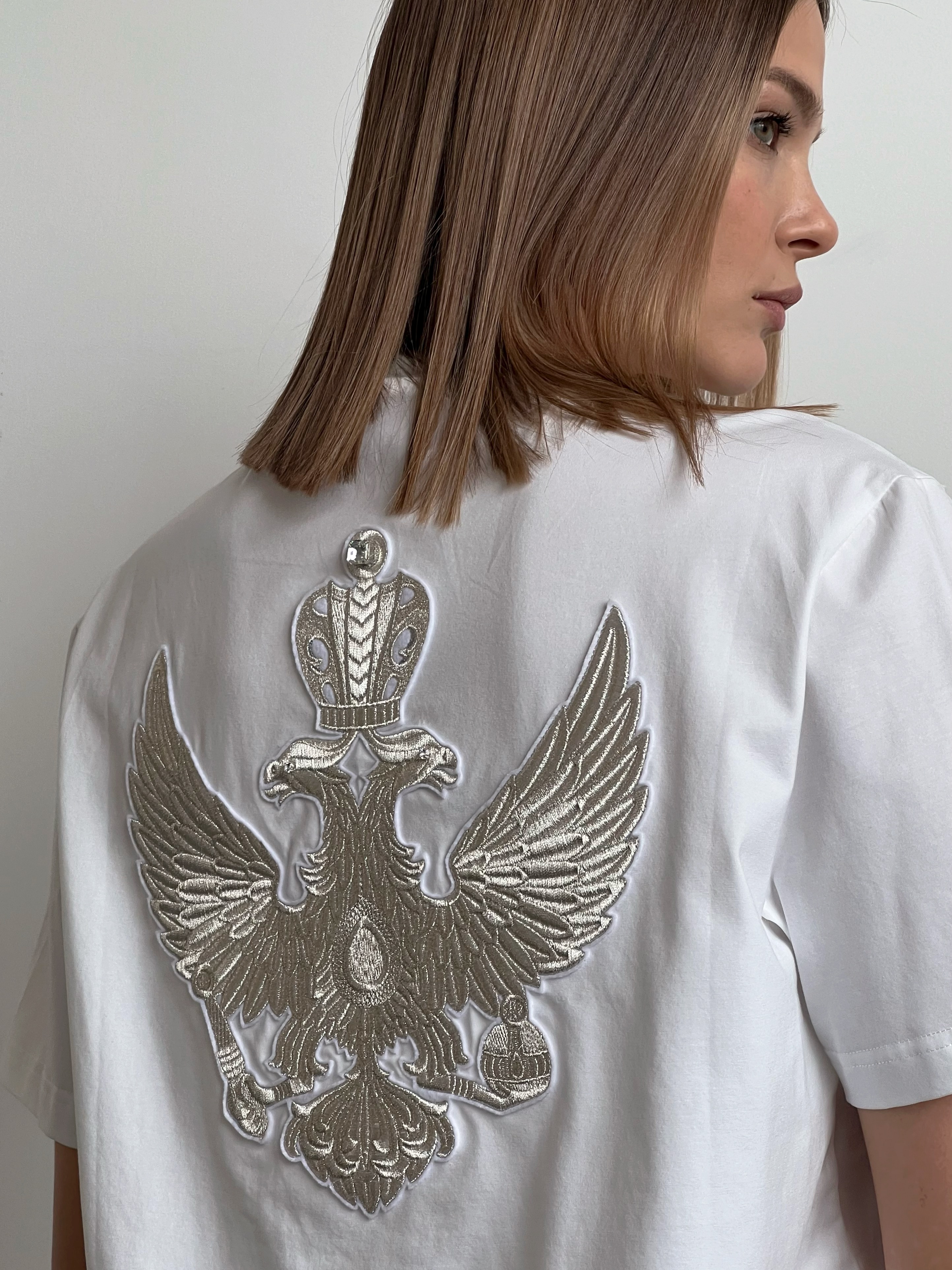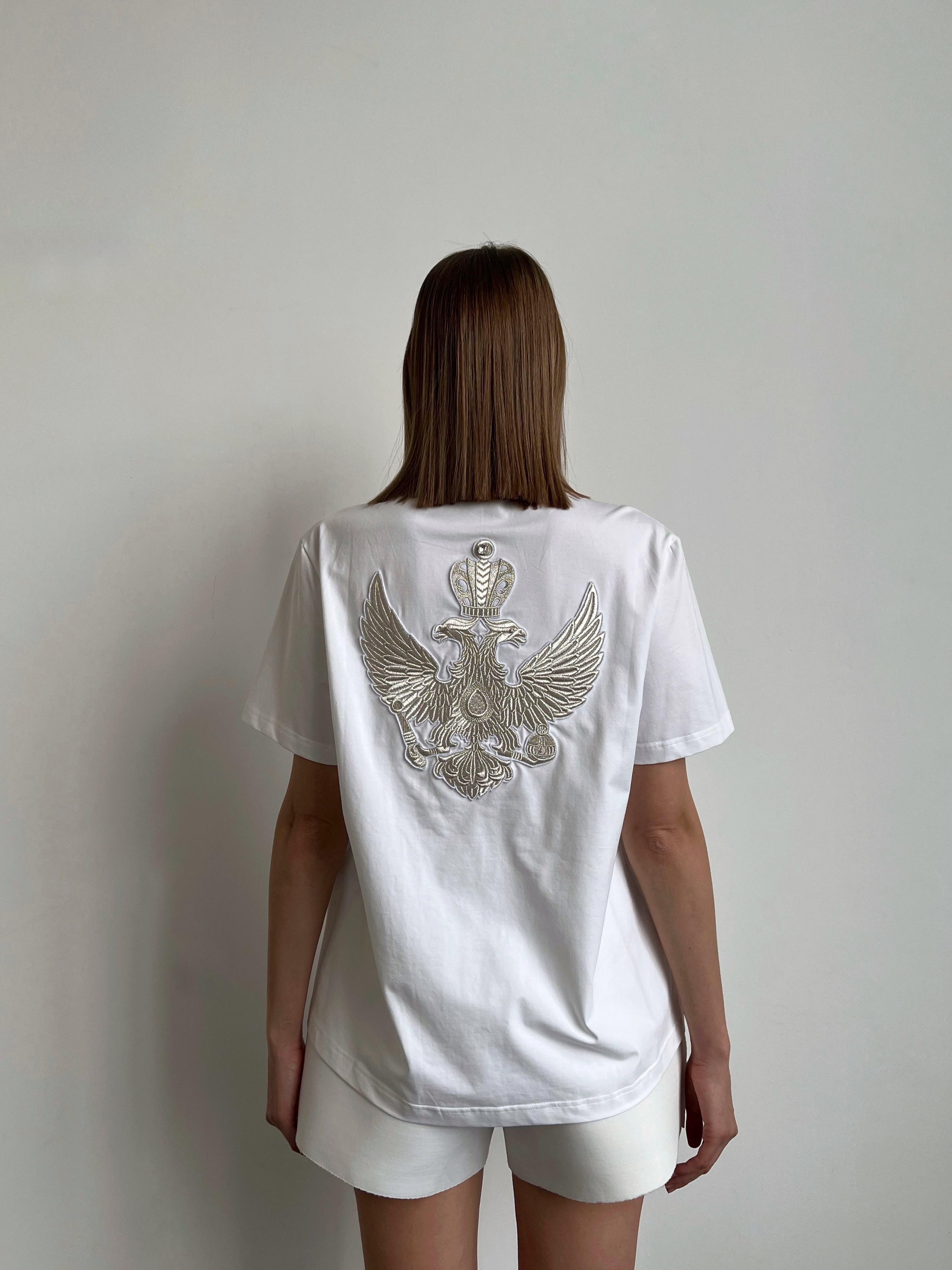 Белая футболка с орлом.