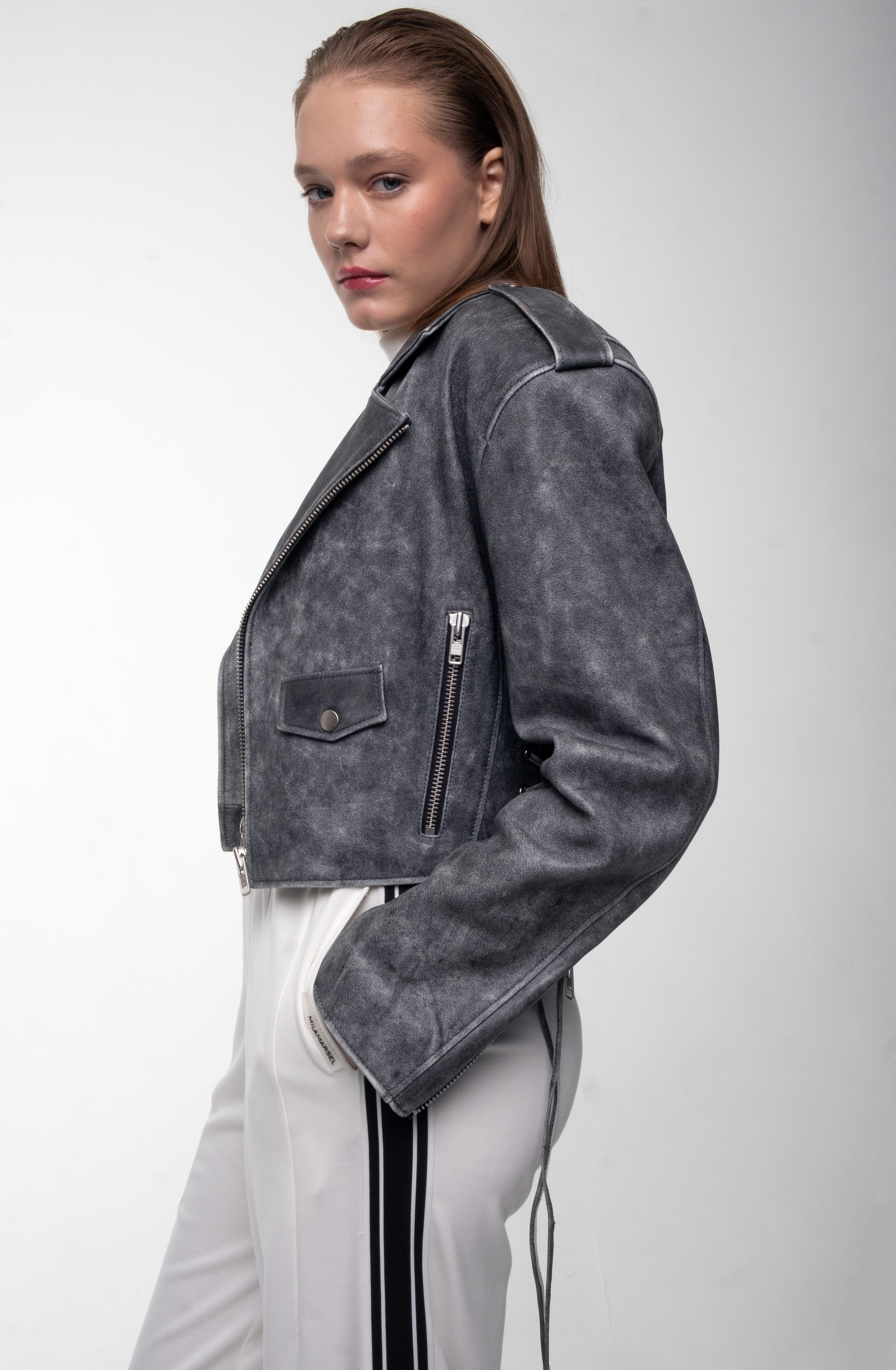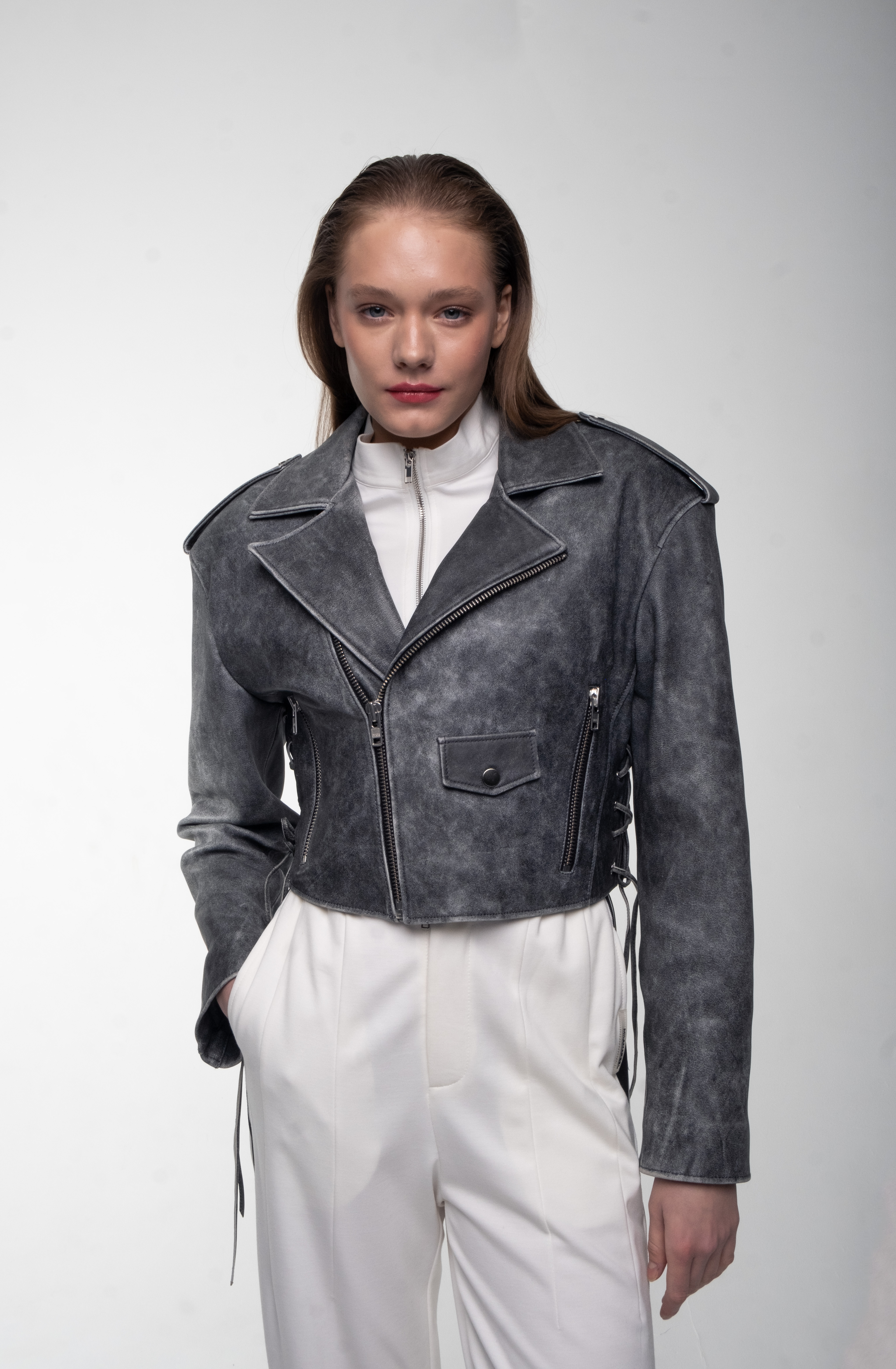 Трендовая укороченная косуха из натуральной кожи.