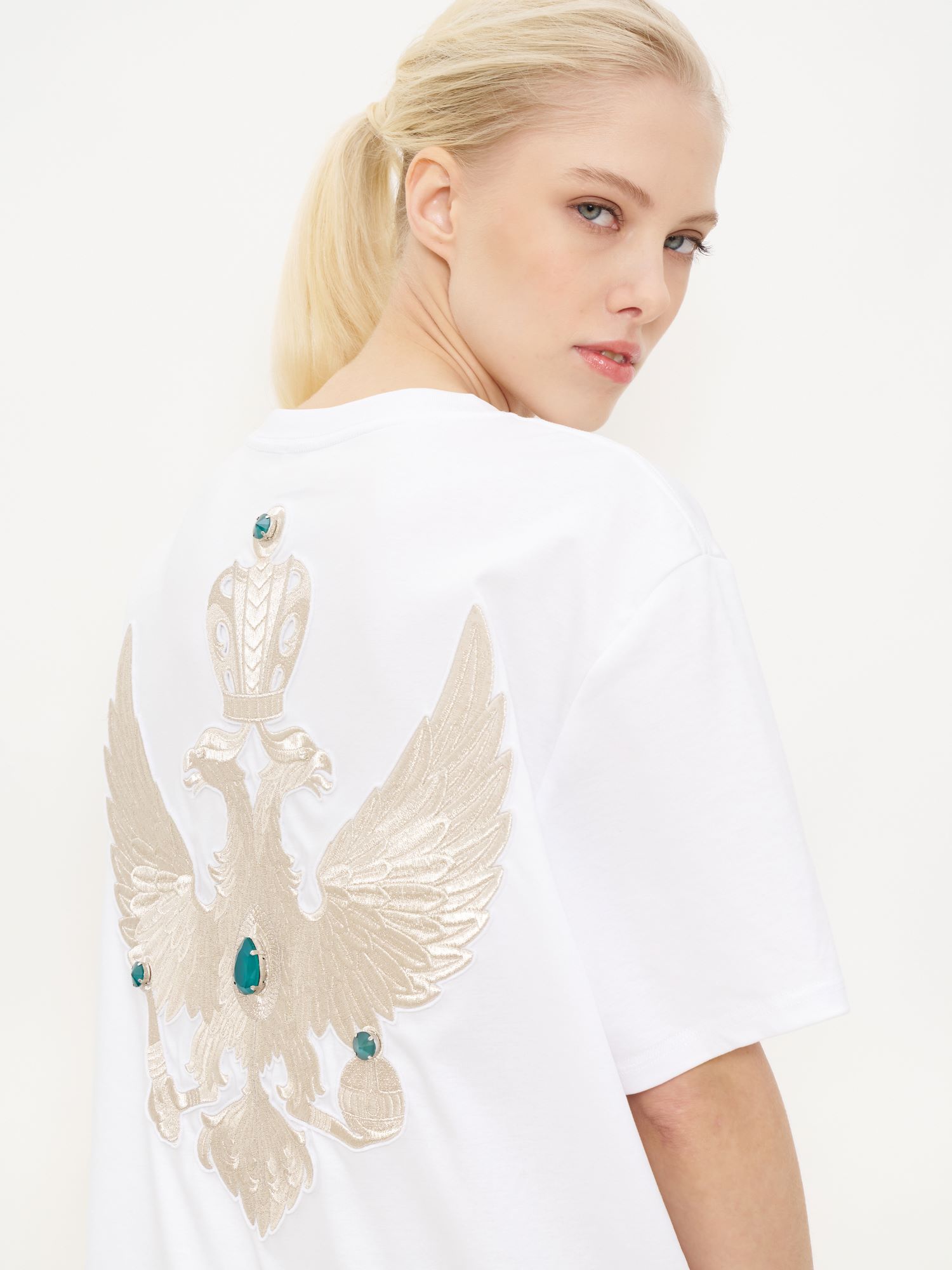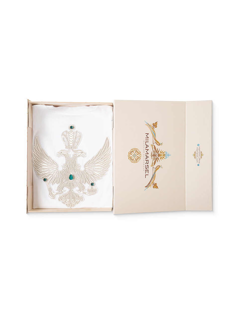 Двуглавый орёл вышит золотыми нитями старинной техникой «в прикреп» торжокскими золотошвеями — это тонкая ручная работа и дань традициям русского ремесленного искусства.