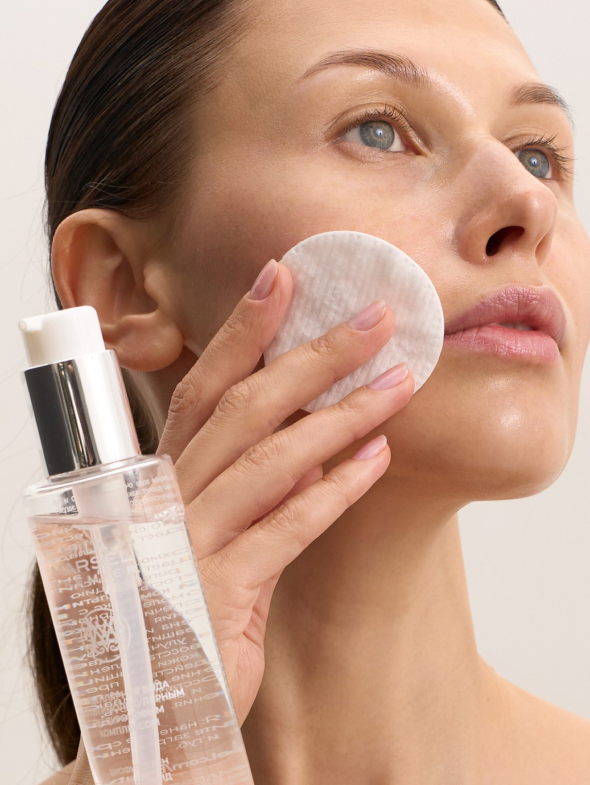 Нанесите средство на ватный диск и удалите загрязнения и макияж с кожи лица, глаз и губ.