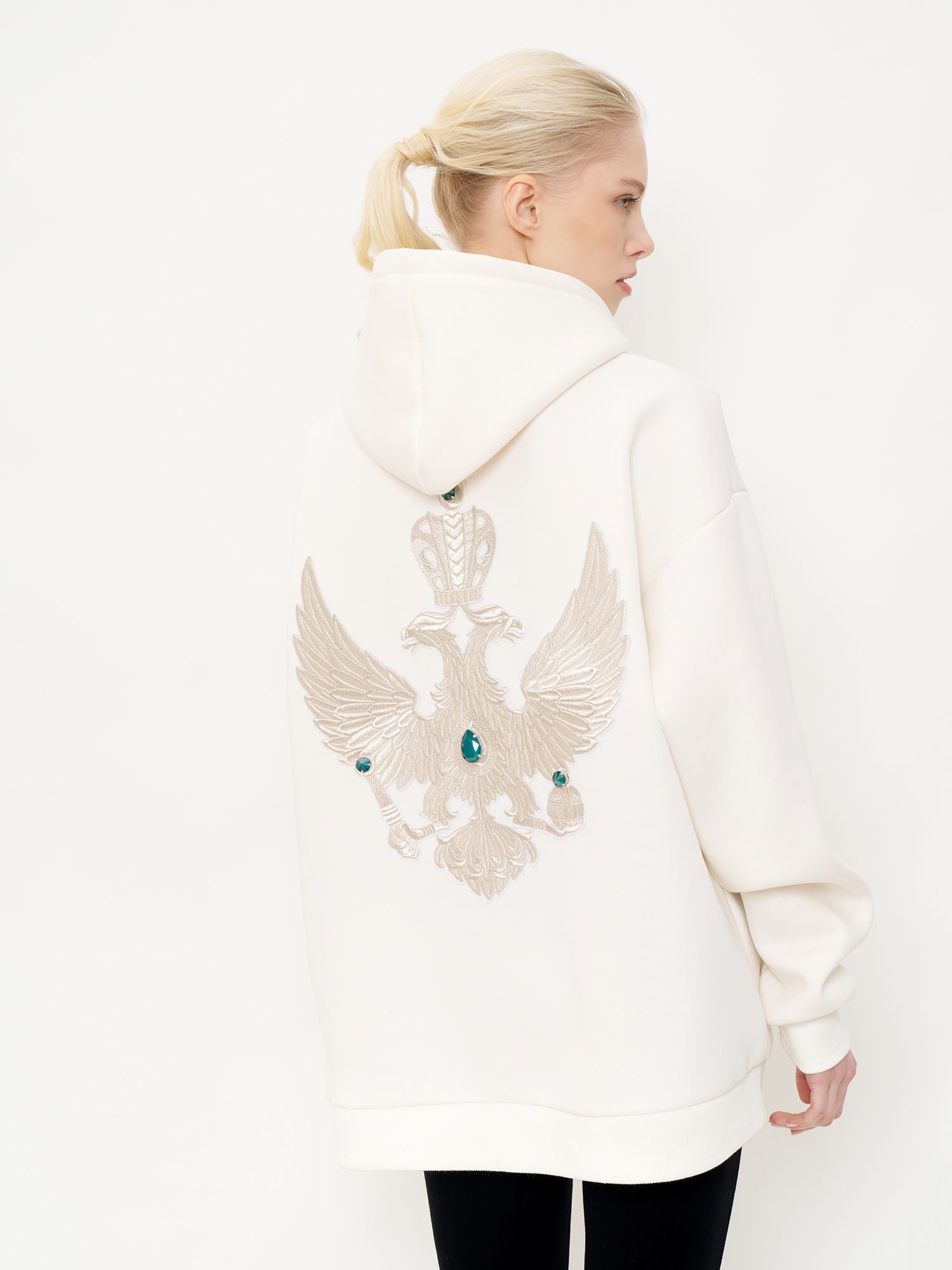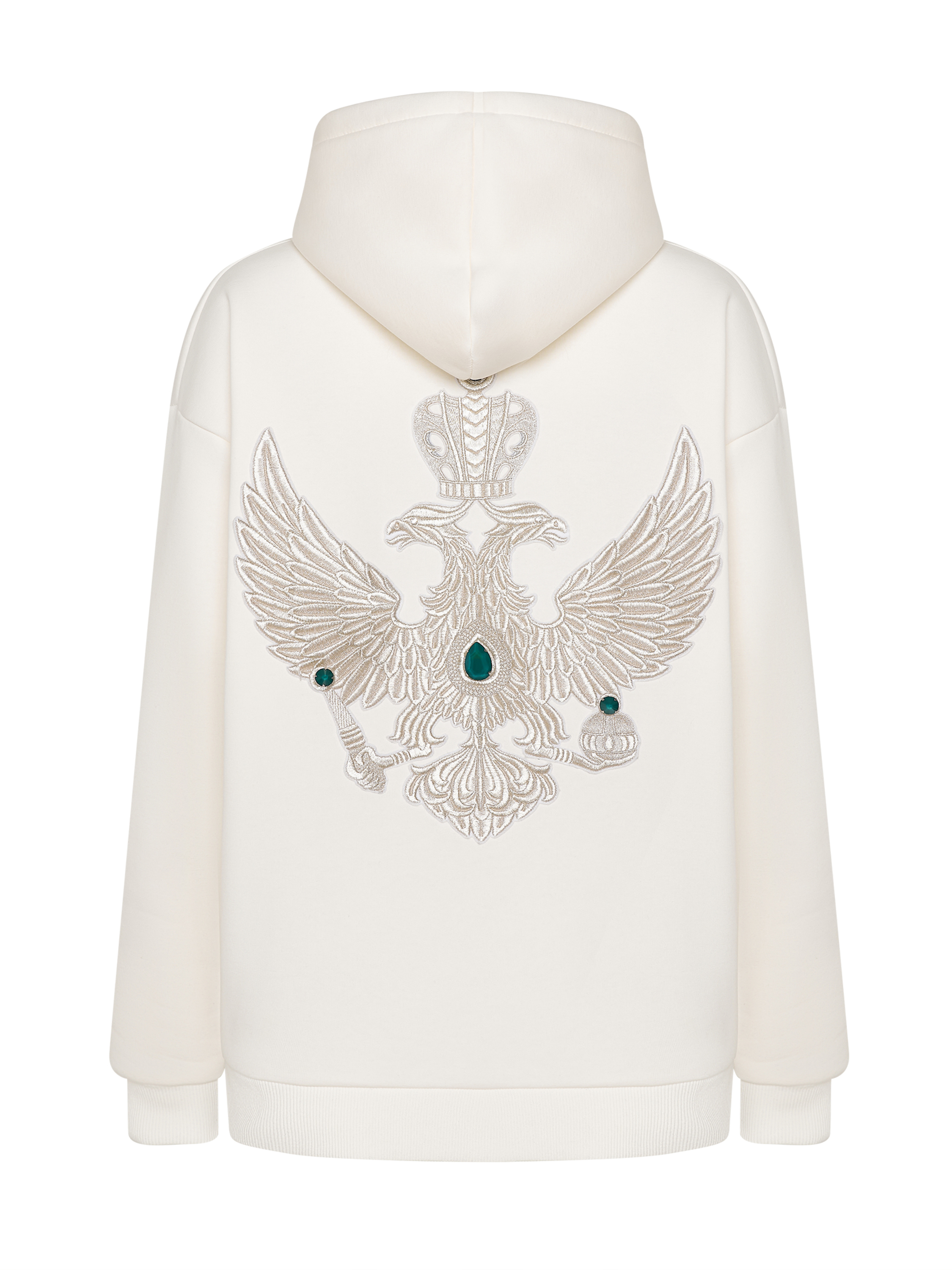 Лимитированное худи «Золотой орел» является продолжением коллекции MILAMARSEL, посвященной России и ее главным образам и символам. Худи повторяет принт экошубы из 100% шерсти – двуглавый орел вышит золотыми нитями старинной техникой «в прикреп» торжокскими золотошвеями и декорирован крупными изумрудными камнями Swarovski. Уникальное сочетание спортивного худи и премиальной ручной вышивки делает изделие абсолютно эксклюзивным и соответствует последним тенденциям мировой модной индустрии на смешение стилей и эклектику. Благодаря универсальному дизайну худи одинаково подходит как женщинам, так и мужчинам.