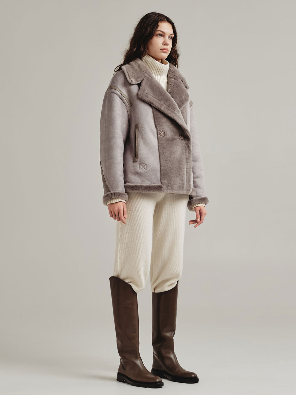 Модель «Наташа Ростова» премиальной коллекции Romanoff представляет собой фасон бомбера, выполненный в виде шубы из экомеха. Изделие является двусторонним и отличается своей функциональностью – с одной стороны оно выглядит как бомбер-дубленка, а с другой как укороченная шуба.