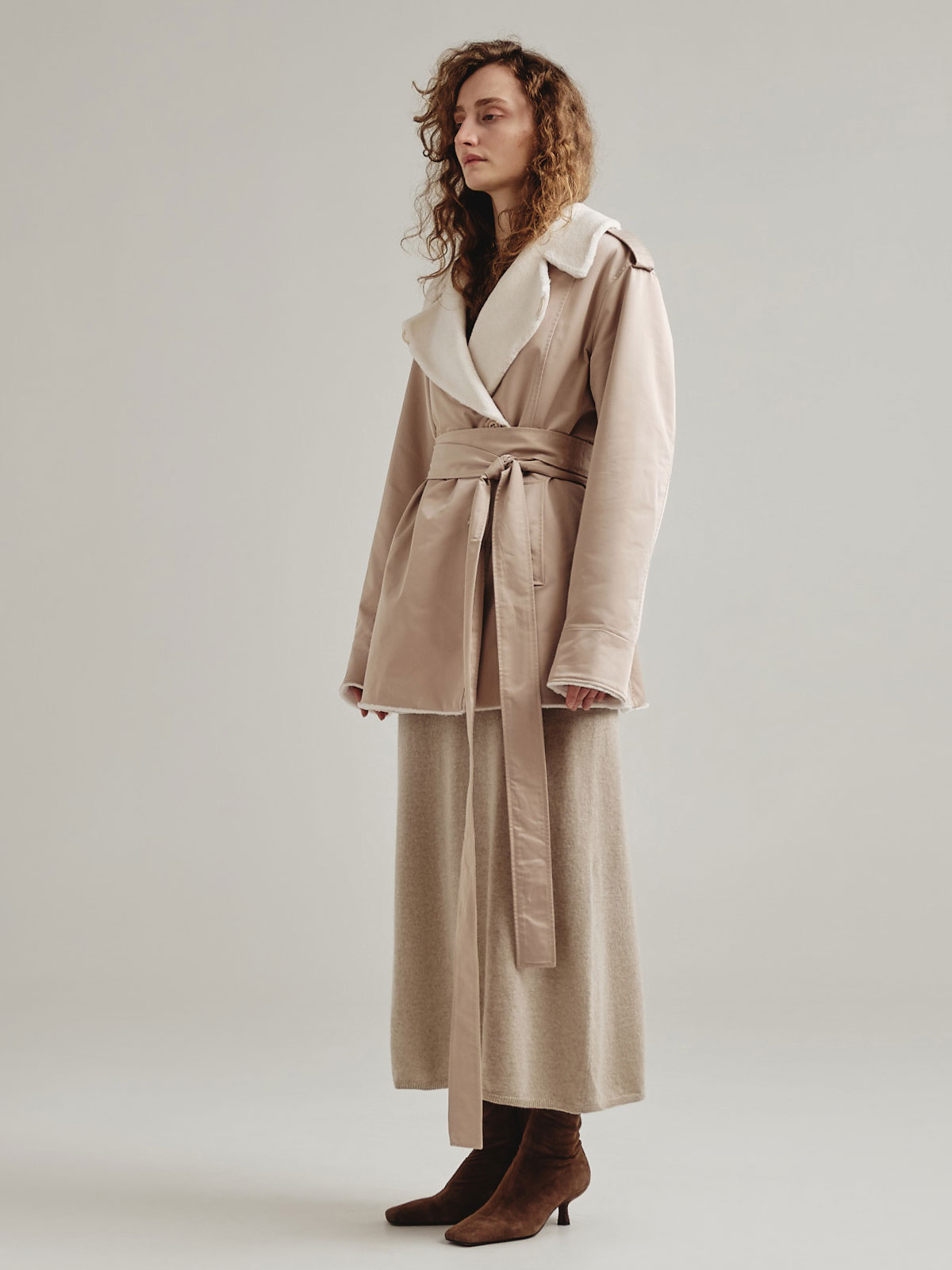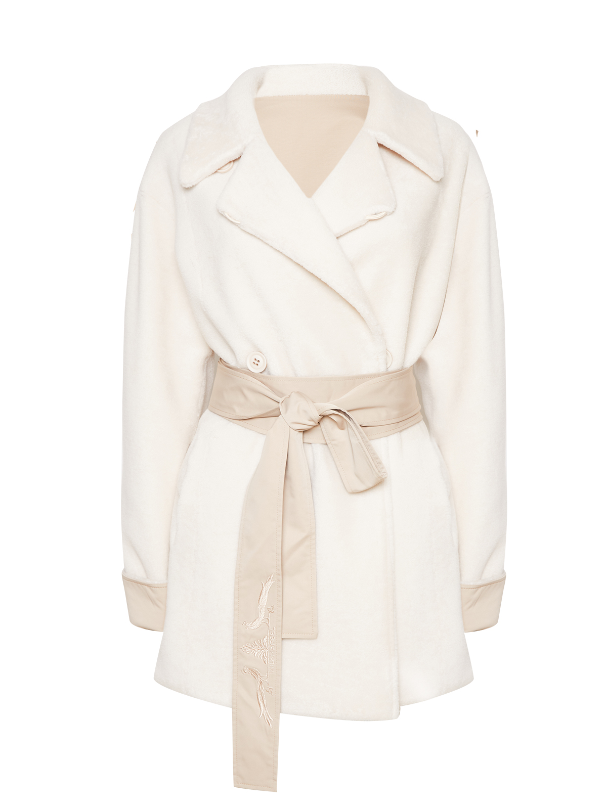 Двусторонняя модель из короткой тонкой шерсти отсылает к классическому тренчу, но представлена в виде легкой экошубы. Изделие дополнено авторским принтом MILAMARSEL с голубыми птицами.