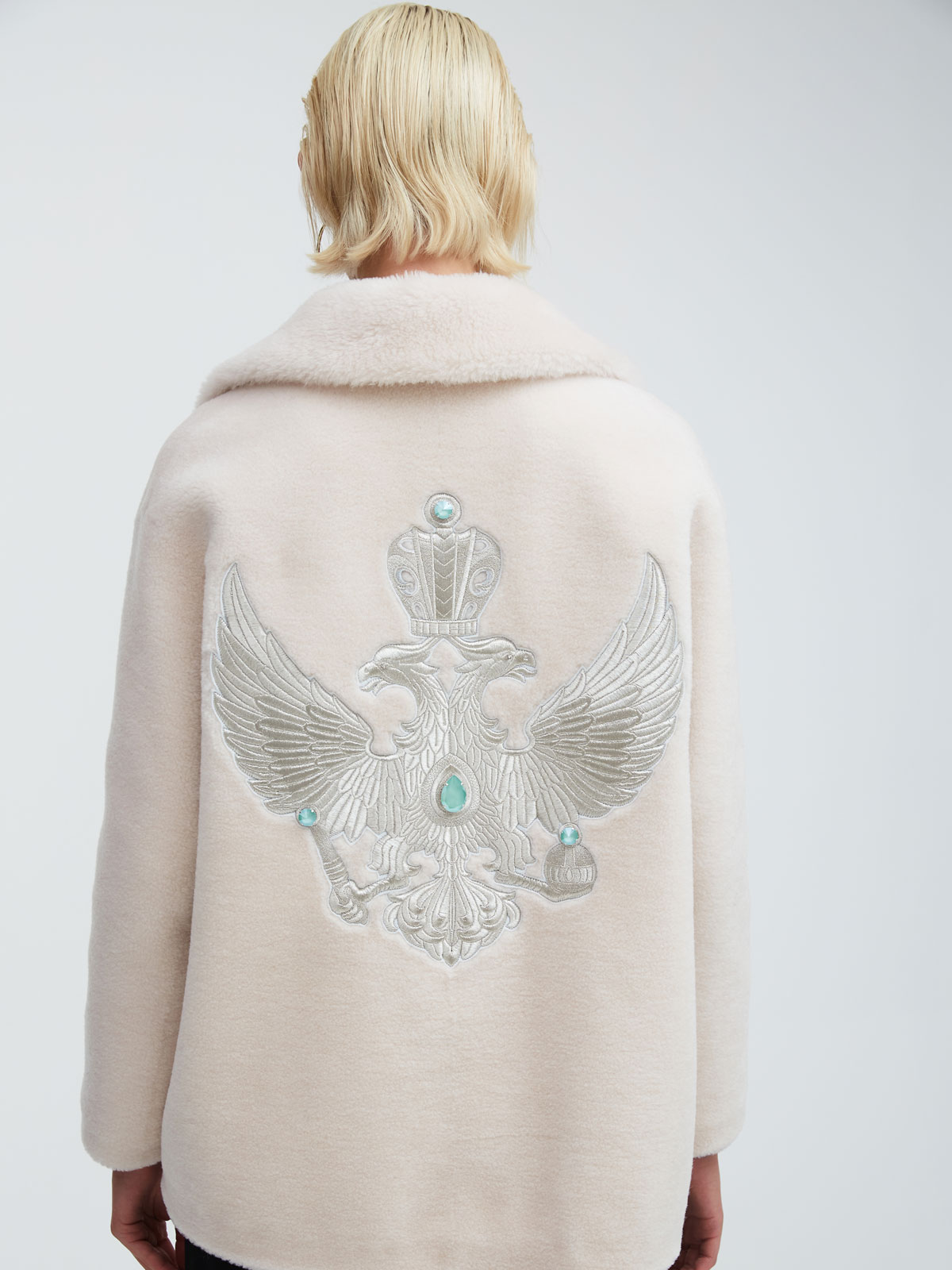 Укороченная шуба из 100% шерсти с двуглавым орлом, вышитым нитями из белого золота – одно из самых роскошных изделий в коллекции. Это исключительное сочетание современных трендов, высоких технологий, эксклюзивного дизайна в русском стиле и исконно русских промыслов, которые воплотились в актуальной и свежей интерпретации. Экомех на этой модели невероятно мягкий и пластичный, поэтому идеально садится по фигуре.