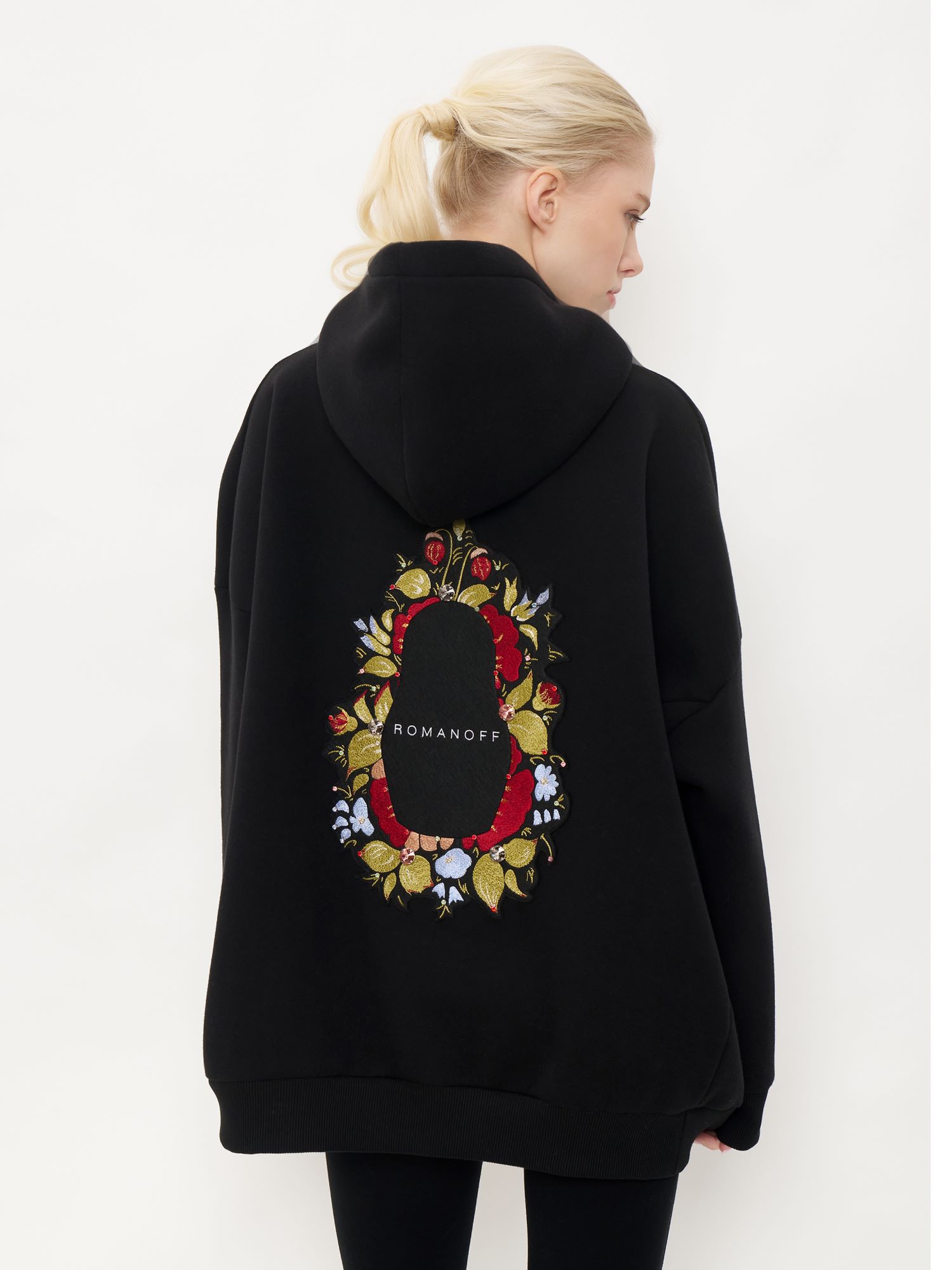 Особое внимание привлекает изысканная ручная вышивка русской матрешки, которая является настоящим произведением искусства. Каждая деталь матрешки проработана с особой тщательностью, отражая многослойность и символизм русского народного творчества. Яркие цвета и сложные узоры вышивки добавляют уникальность и индивидуальность, превращая это худи в выразительный элемент стиля.