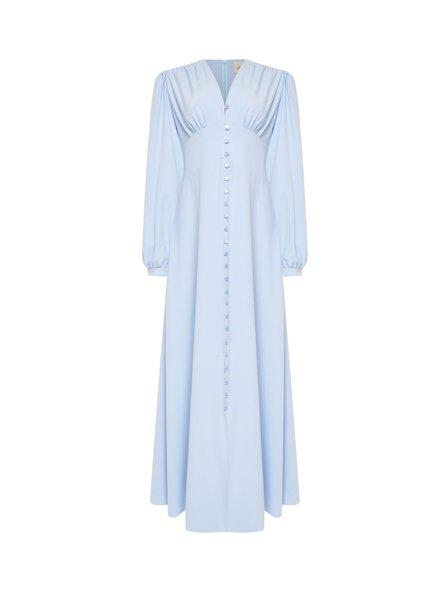 Нежный шелк, деликатное декольте, длинный рукав, пуговицы по всей длине платья – делают модель Енисей самой женственной в коллекции Ателье.
